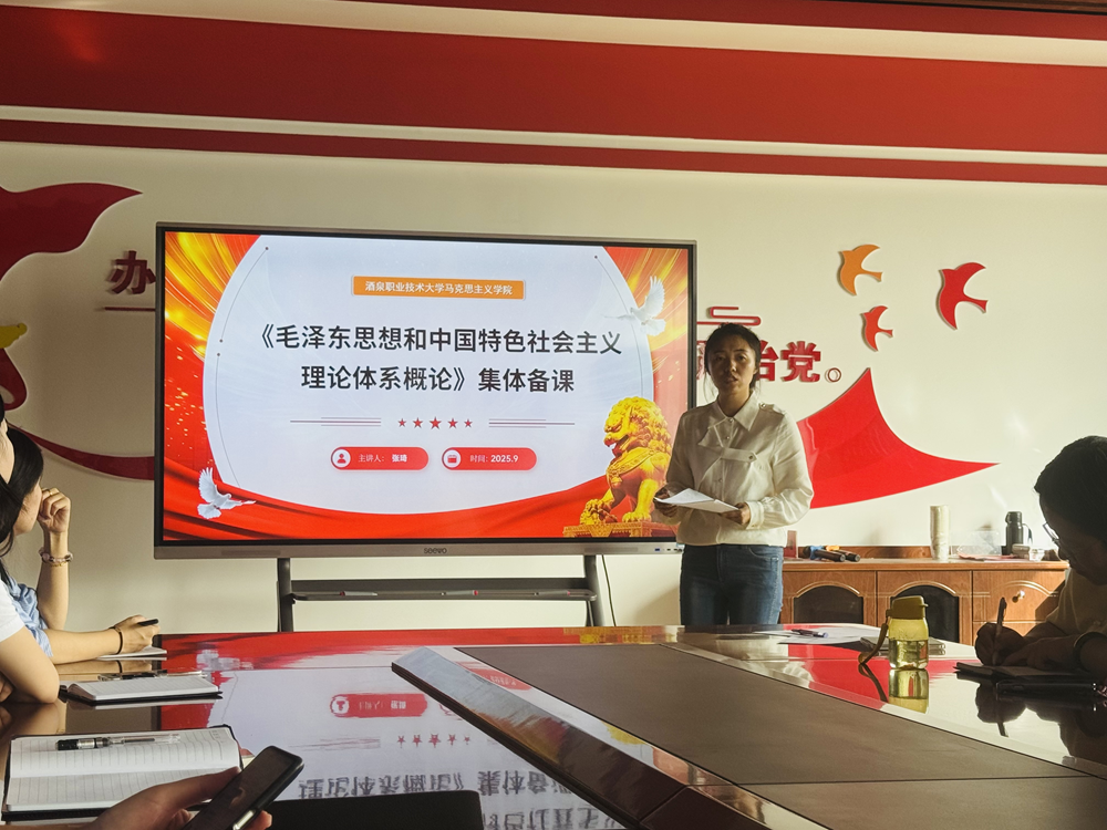 2025年9月2日,酒泉职业技术大学马克思主义学院在208会议室举行“毛泽东思想和中国特色社会主义理论体系概论”课程导论部分集体备课会。本次备课会由我院张琦老师主讲,学院全体思想政治理论课教师参与研讨,旨在深入理解和把握新教材的指导思想与核心内容,进一步提升教学质量与效果。
