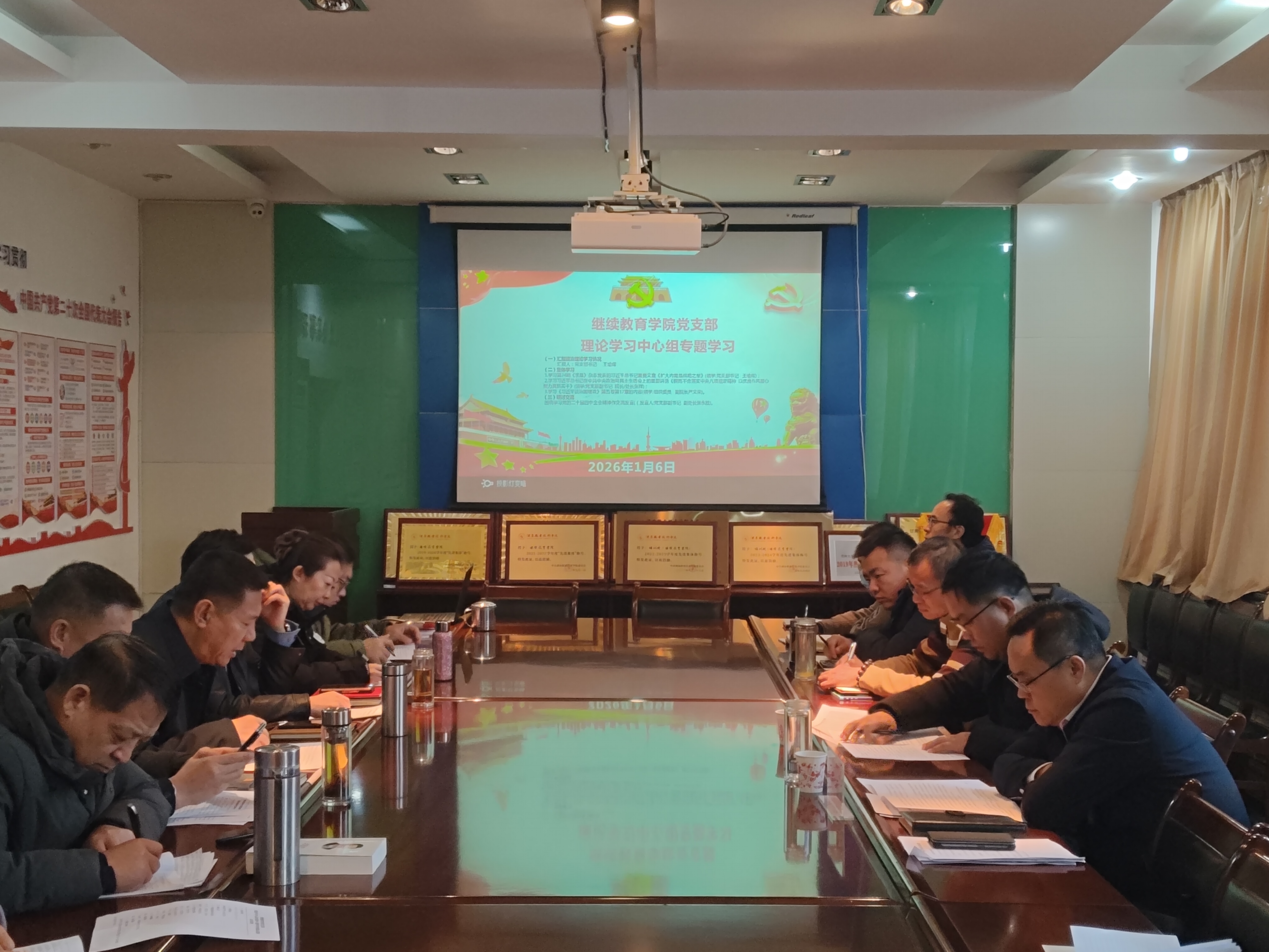 为持续深化党的创新理论武装,推动党建与继续教育事业深度融合,1月6日上午,继续教育学院党支部理论学习中心组以“强化理论武装、赋能继教发展”为主题召开专题学习会暨党的二十届四中全会精神专题研讨会。学校党委委员、副校长杨明列席会议指导,学院党支部书记王瑜珲主持会议,中心组全体成员参加学习研讨。