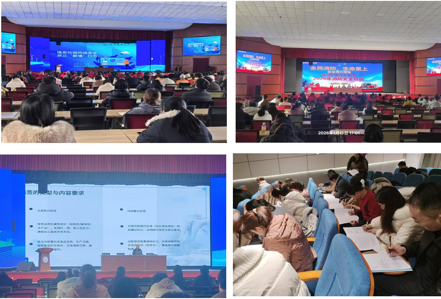 院系动态 > 正文为深入贯彻落实校园安全专项整治“回头看”工作要求及学校寒假前后校园安全稳定工作部署,进一步压实校园服务从业人员安全责任,提升专业素养与实操能力,1月15日至16日,学校后勤管理处协同酒泉职业技术大学科技园有限公司在胡杨文化活动中心、弘毅楼C座问道厅分场次举办校园安全专题培训。