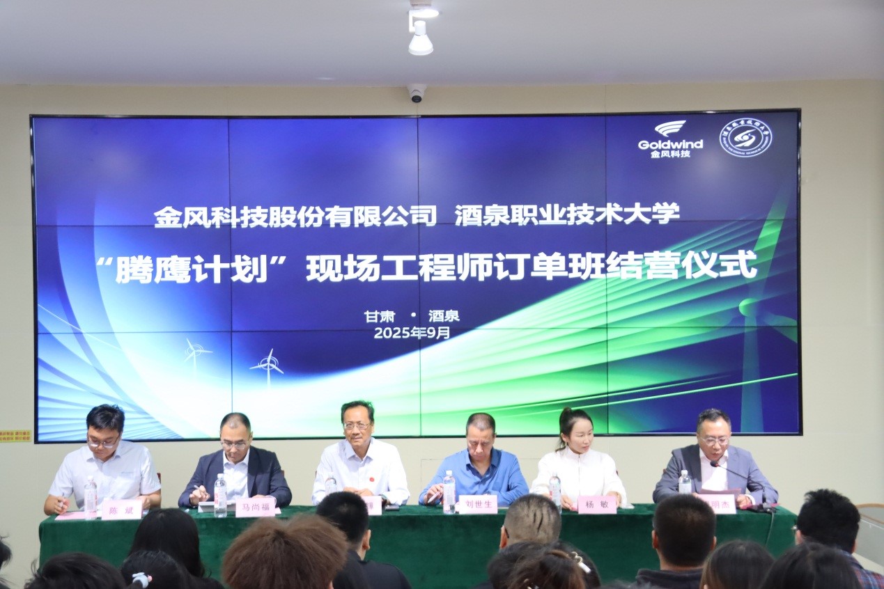 2025年9月20日下午,金风科技“腾鹰计划”现场工程师订单班结营典礼在酒泉职业技术大学圆满结营。酒泉市人力资源与社会保障局三级调研员刘世生,酒泉职业技术大学党委委员、纪委书记、监察专员魏韡,金风慧能西北区域公司总经理马尚福、金风教育培训中心产品研发总监陈斌、金风慧能人力资源部人力资源经理杨敏等校企领导出席仪式。典礼由新能源工程学院党支部副书记、院长程明杰主持。新能源工程学院全体风电专业教师、订单班同学、24级风力发电工程技术、新能源装备技术同学参会。