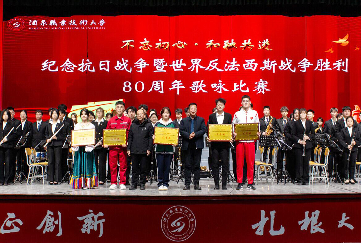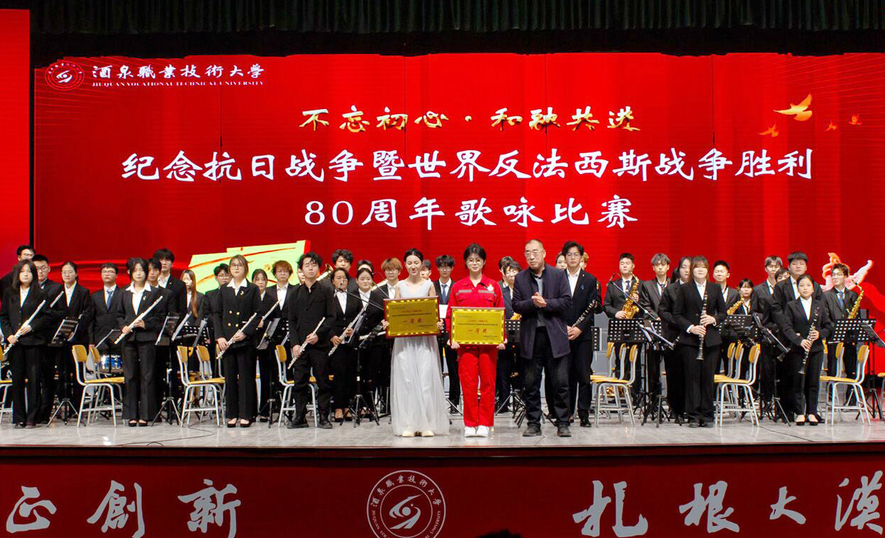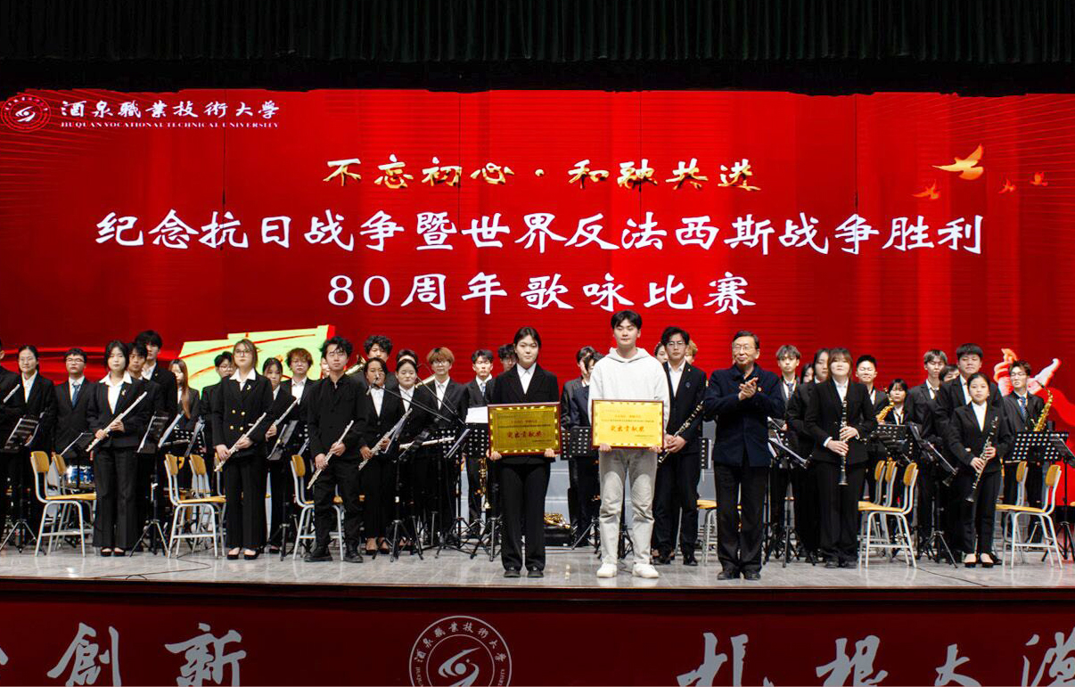 2025年12月9日晚,酒泉职业技术大学胡杨文化活动中心内歌声嘹亮,“不忘初心·和融共进”纪念中国人民抗日战争暨世界反法西斯战争胜利80周年歌咏比赛在此举行。学校党委班子成员、相关职能部门负责人、各学院班子成员以及师生代表齐聚一堂,以青春之声回溯峥嵘岁月,用赤子之心凝聚奋进力量。
