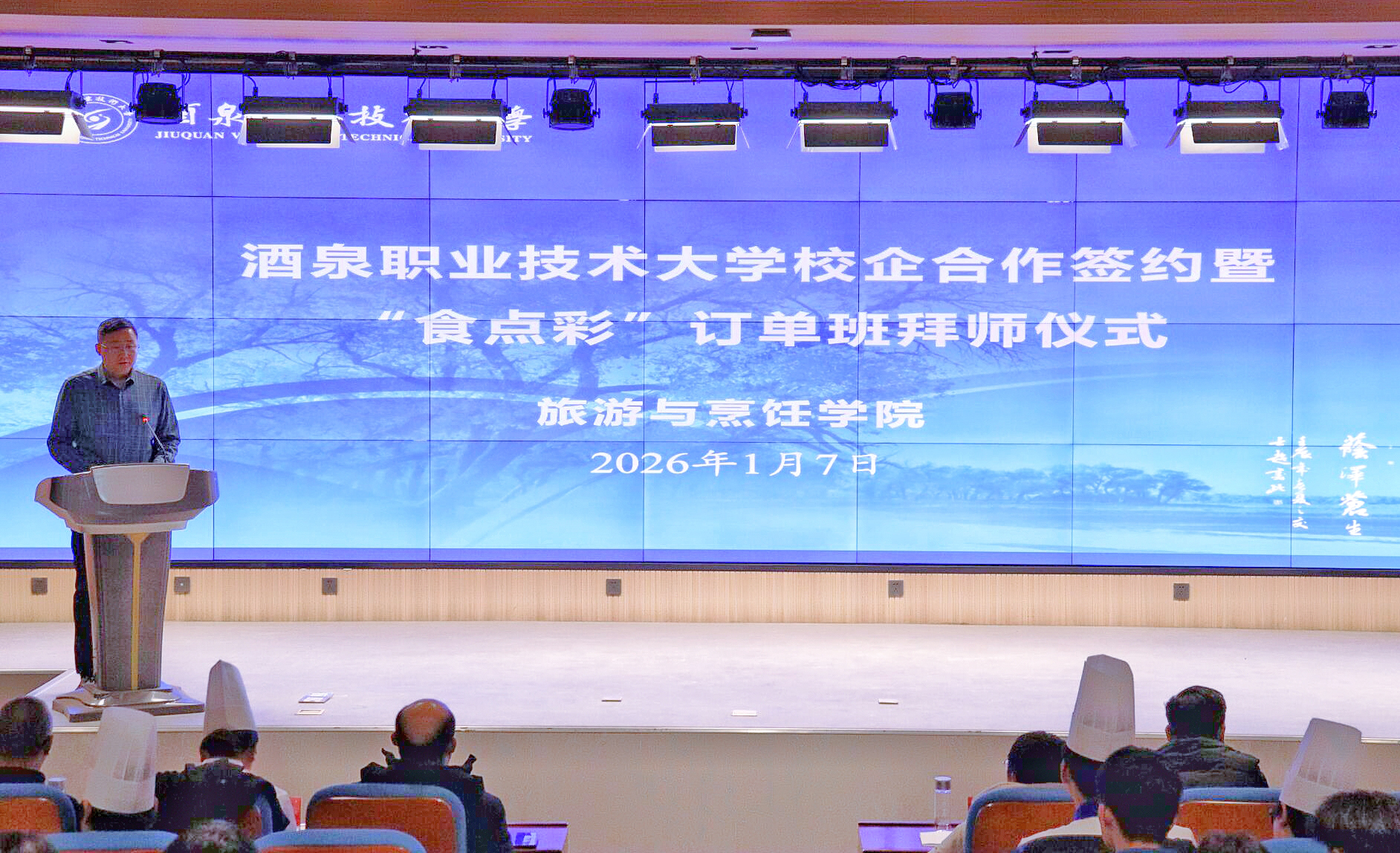 2026年1月7日下午,酒泉职业技术大学与深圳市食点彩食品餐饮有限公司校企合作签约暨“食点彩”订单班拜师仪式举行。深圳市食点彩食品餐饮有限公司总经理孙伟民、企业导师谢海蓉,酒泉职业技术大学党委委员、副校长杨洁等出席会议。产教融合处、教务处、旅游与烹饪学院相关人员参加会议。